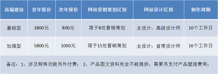 報價:首年3800,次年和次年以后服務費800,一次性購買2年價格為4300,優(yōu)惠300元;適用企業(yè):有豐富的圖文素材,希望通過網站展示企業(yè)實力、品牌、形象打造客戶信任度的企業(yè);