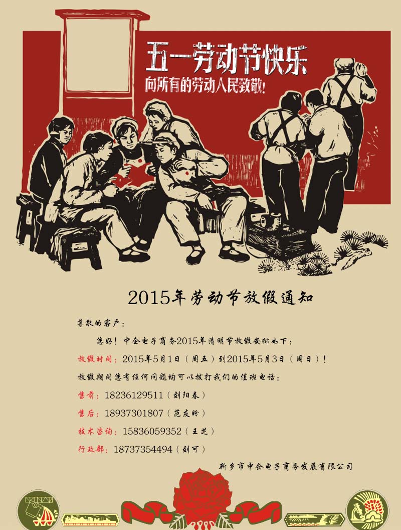 2015年中企電商五一勞動(dòng)節(jié)放假通知 更新時(shí)間:2015-04-30點(diǎn)擊次數(shù):5603次